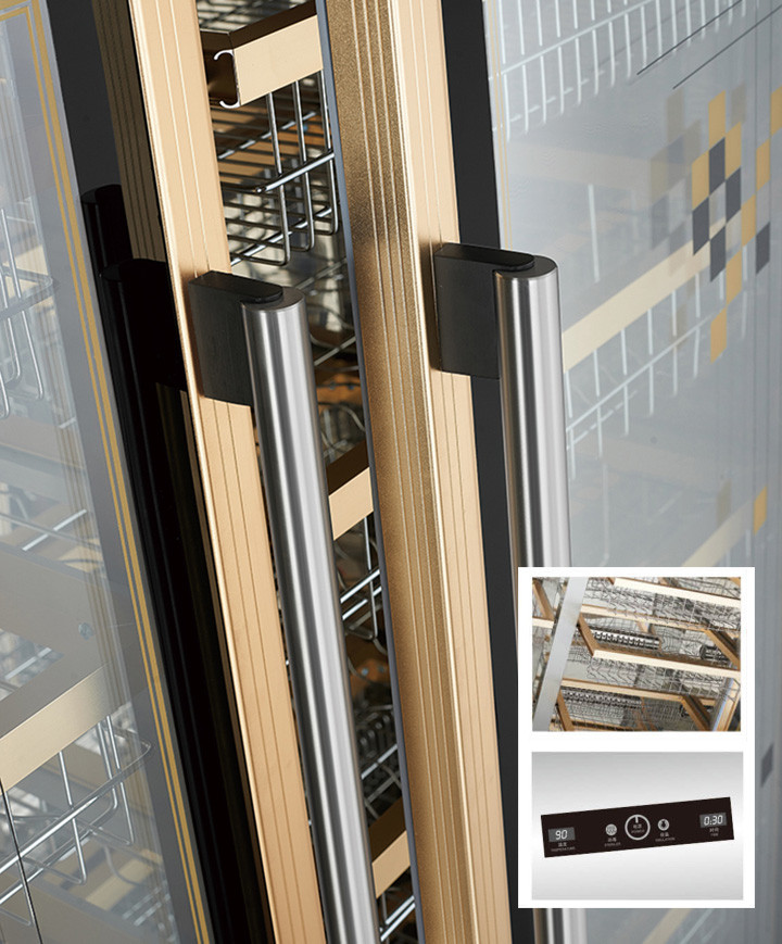 電腦控制觸摸屏,光波高溫消毒;可透視玻璃門,整體發(fā)泡保溫;豪華不銹鋼把手,鋁合金推拉式導軌;特設超高溫保護功能。